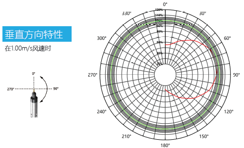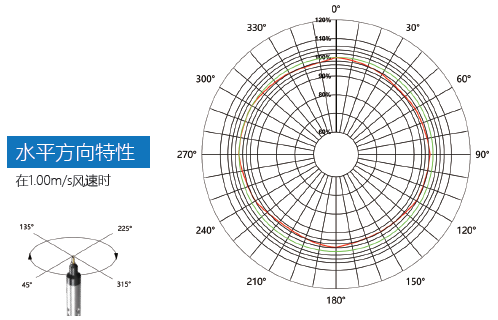 JT1406風(fēng)速傳感器探頭為全向響應(yīng),這一性能對(duì)未知風(fēng)向或不穩(wěn)定風(fēng)向、隨機(jī)風(fēng)向的風(fēng)速測(cè)量尤為重要,JT1406在水平方向擁有優(yōu)秀的方向響應(yīng)特性,在不同角度(風(fēng)向垂直于探頭指向)的來風(fēng)方向都能保持快速響應(yīng)和精確測(cè)量。